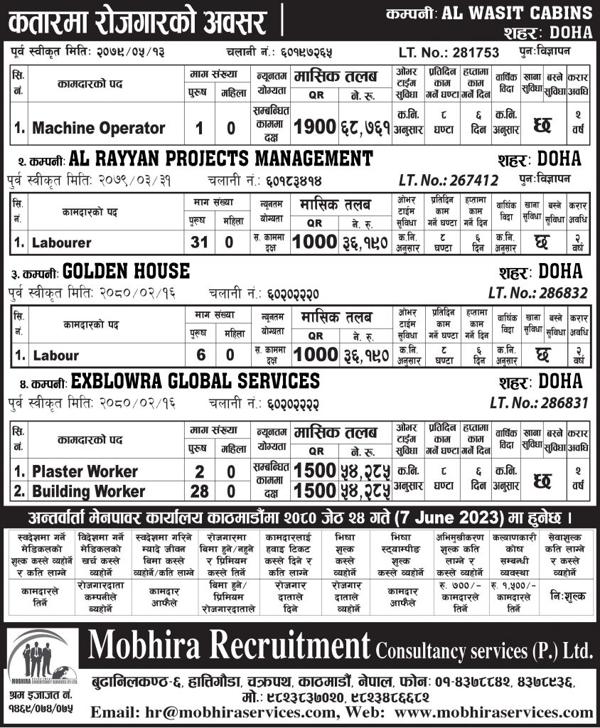May 31, 2023 By mobhira2018 In Qatar 0 LT. No: 281753, 267412, 286832, 286831 Search Search for: Categories UAEQatarSaudi ArabiaKuwaitMalaysia Recent Jobs LOT NO. 301333/ EMDAD HUMAN RESOURCES COMPANY/ KSA New Demands – EUROPE, KUWAIT, QATAR